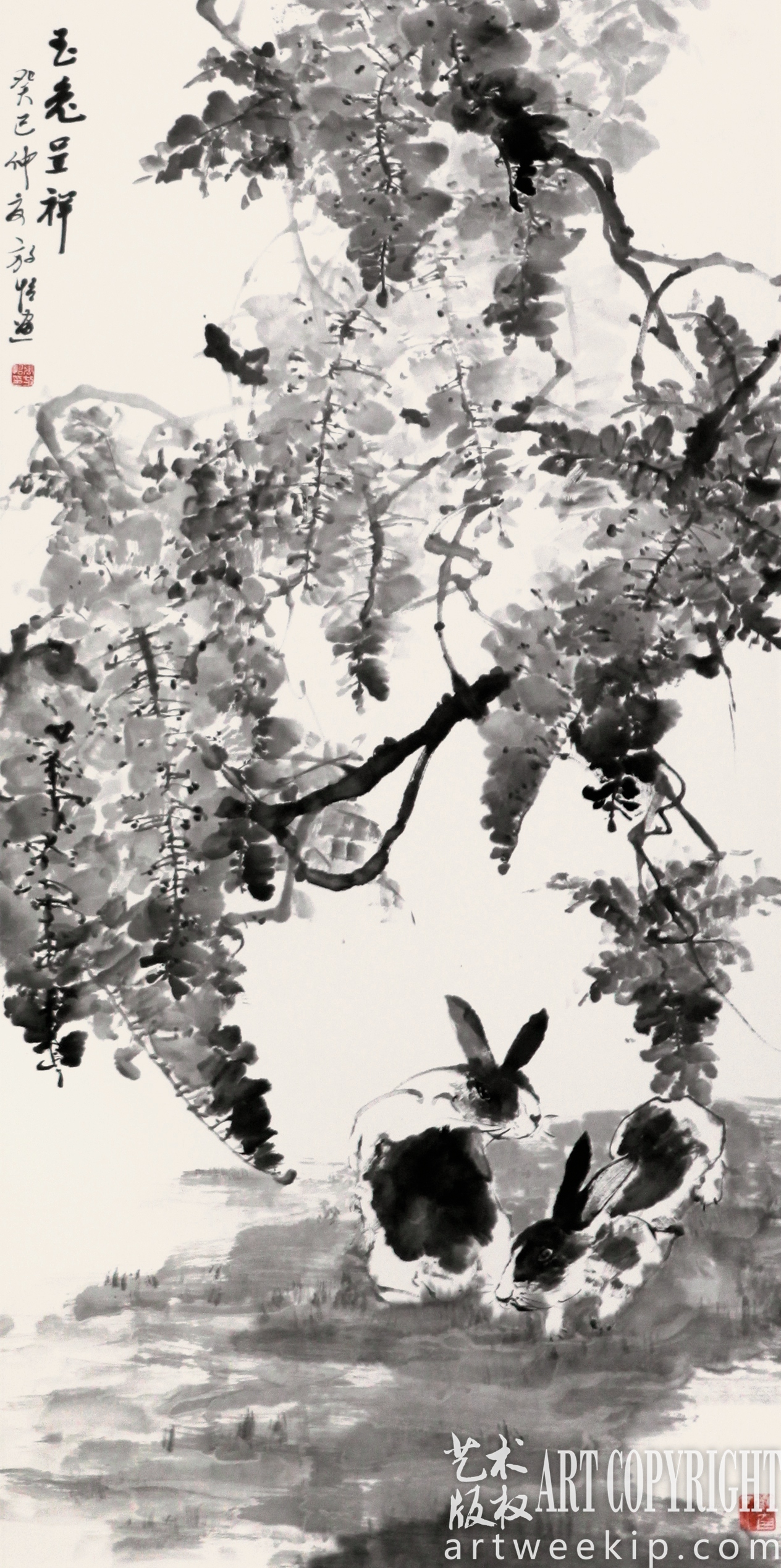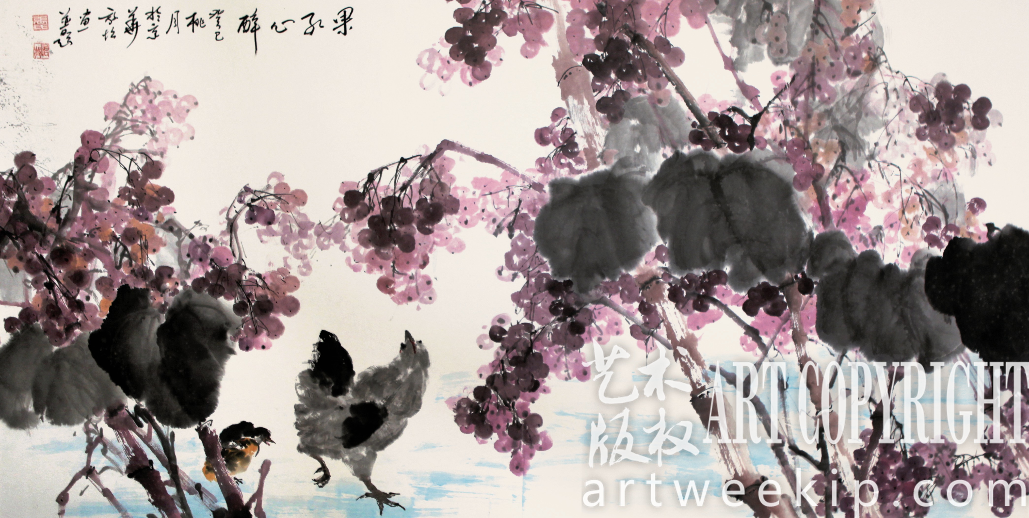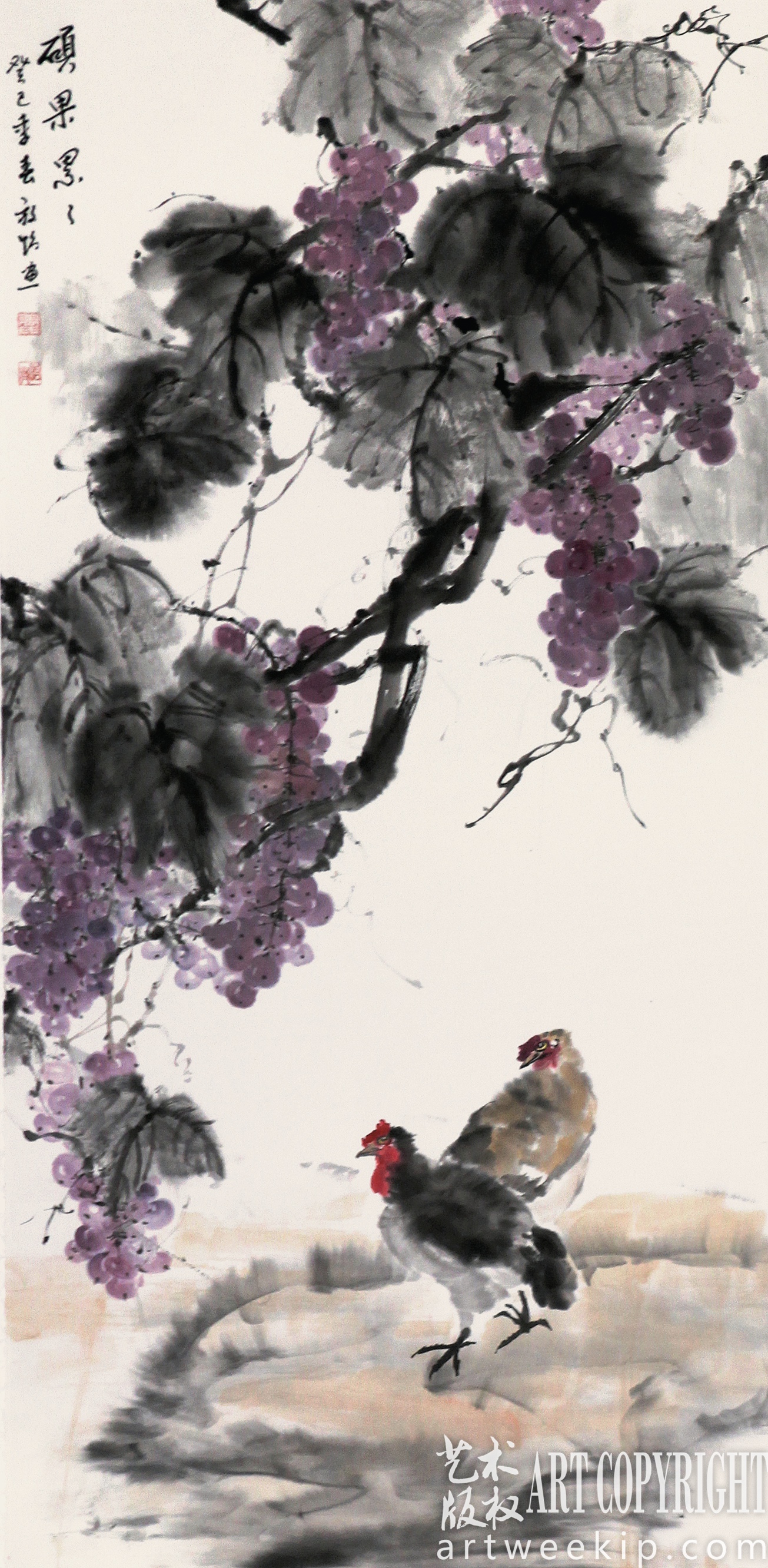 他画的紫藤和葡萄也别有风调。紫藤花柔韧的花茎缠满凉亭,垂下的串串花枝瀑布般馨香饱满。那花朵远看像舒放的云翳,近看像抱团的星子。张放怡擅用色彩,尤其喜爱高贵大气的紫色。由于紫藤花的花瓣中心呈杏黄色,他还别出心裁地使用“滴画”的方法,在画面上甩出一层玲珑的黄色墨点。成熟的葡萄累累结实充满了质感,深深浅浅的彩墨描画出颗颗果实的情态,葡萄叶则用大写意手法铺排,葡萄藤盘绕、卷曲、蜿蜒,藤下两只野鸡争食掉落的清甜。一派乡野场景,竟画得这样自在自得、神采宛然!