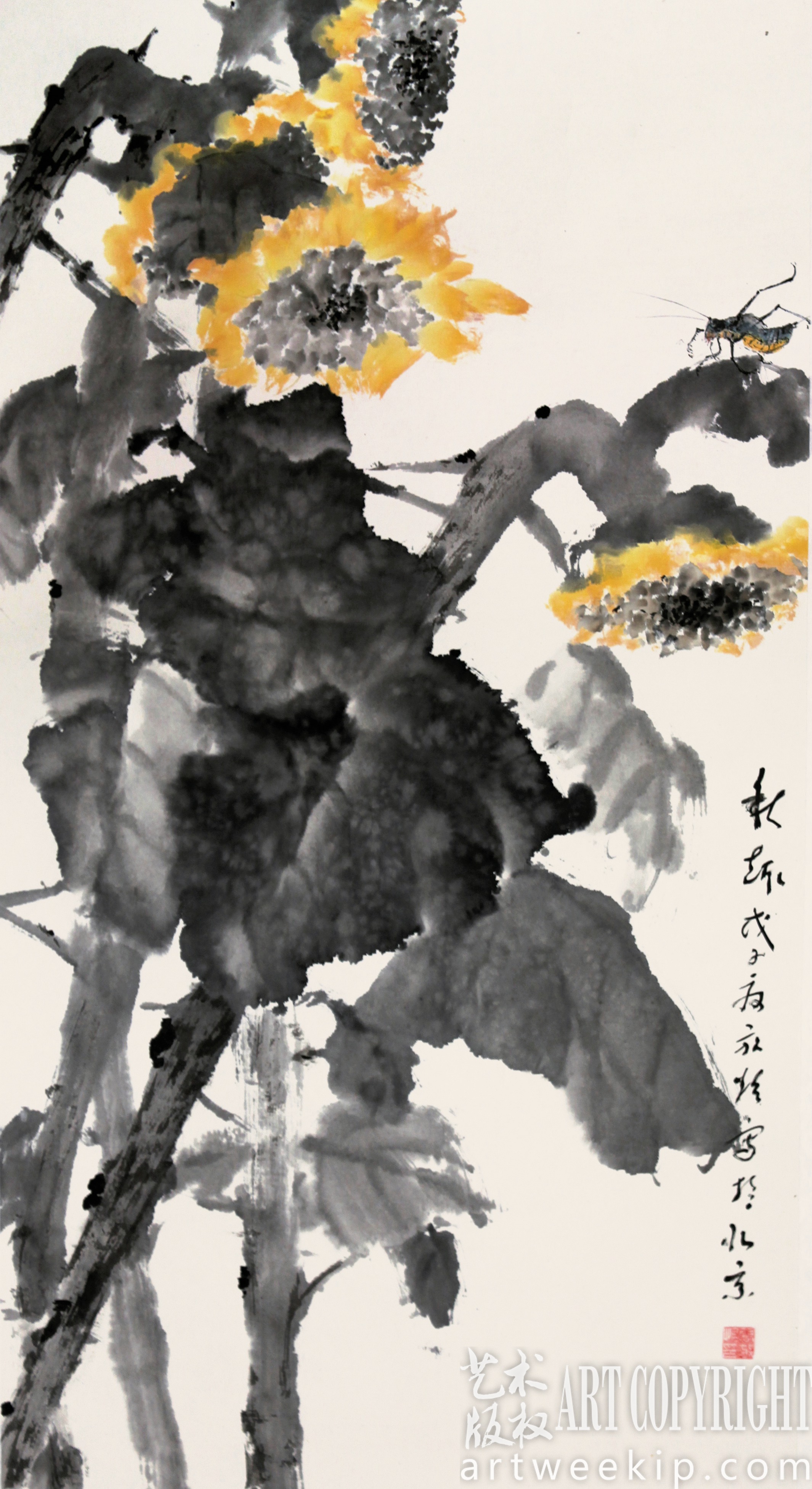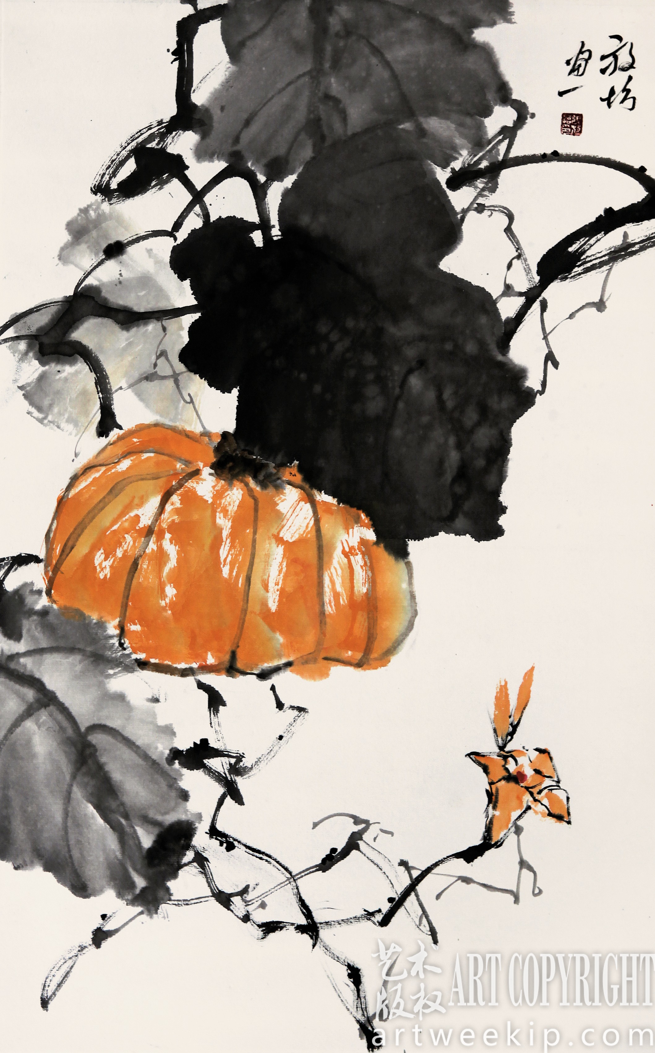 他画大写意花鸟,并不刻意追求形似,妙处恰在于似与不似之间。他很骄傲自己的军旅出身,作画讲究构图,能够删繁就简,直命要害,体现了大刀阔斧的军人风度。他亦很讲章法,墨的浓淡、干湿、灰白,画面的疏密、虚实、远近,都体现了辩证的哲学思考。他画的不着色的水墨,笔致错综而有韵律,墨分五彩而缤纷照眼,是十分清俊秀雅、值得玩味的当代文人画。他画的一些小品,比如南瓜、柿子之类,用笔条畅而老辣,用墨明润而精绝,除了形成特殊的风貌,已在追求独立的笔墨趣味。