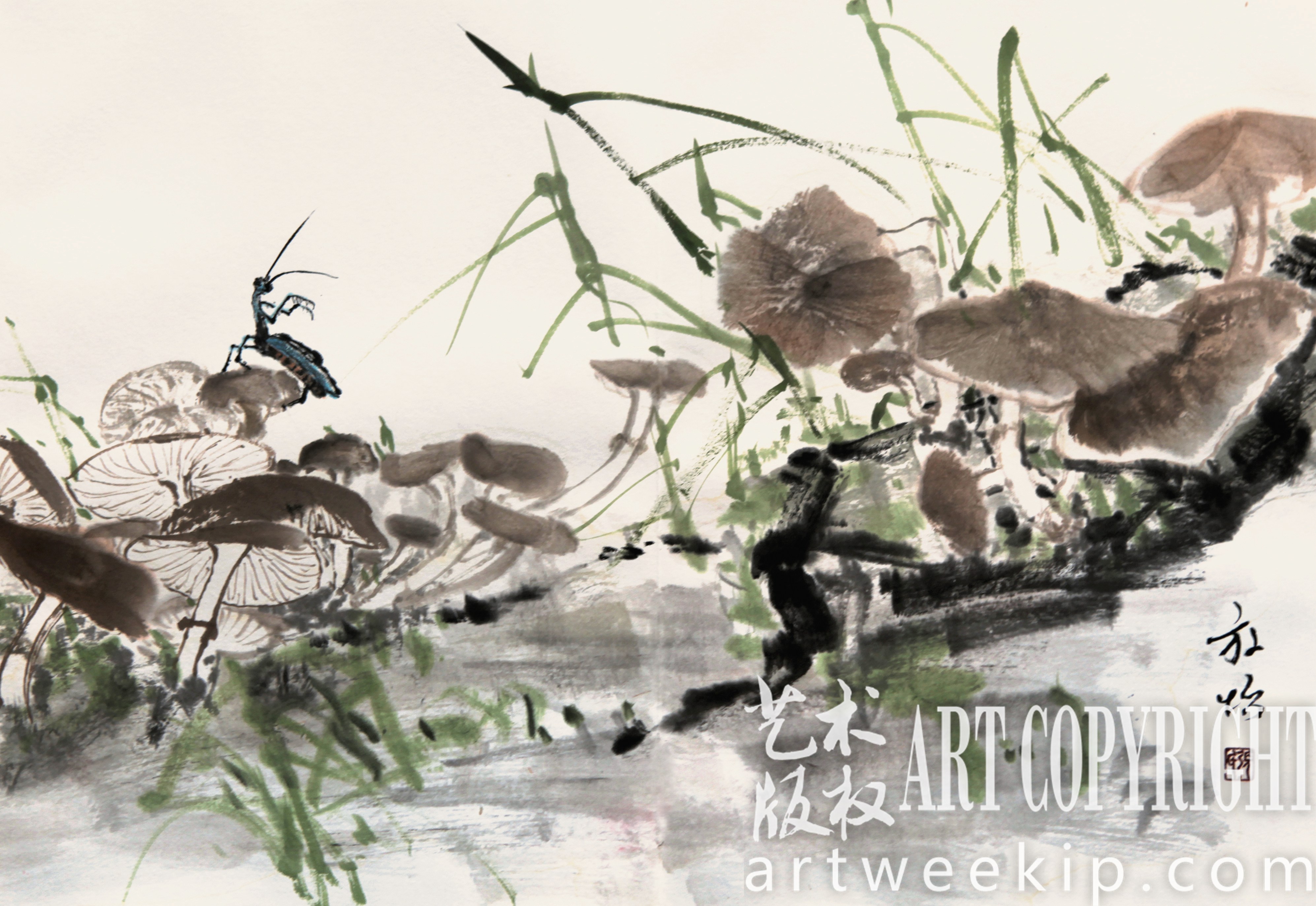 张放怡是一位写生型的画家。别看大写意画起来纵横捭阖,沉着痛快,背后却有着长年的积淀。古人说“搜尽奇峰打草稿”,张放怡无法“搜尽奇峰”,却从小养成了收集一切可用的视觉素材的习惯。60年代缺乏专门的美术书籍和画册,他就搜集报纸、杂志、日历、招贴、火柴盒、包装纸……只有有国画素材的,都被他剪裁下来,集结成册。他亲自到黑龙江的林区、黄山等地,拍了数百张各种菌类的照片。这些照片成了他创作灵感的来源。在清华美院高研班进修期间,他又只身到西双版纳写生,西双版纳繁多的物种和复杂的生态,让他深刻了解了生命和自然,从而有豁然开朗的感觉。